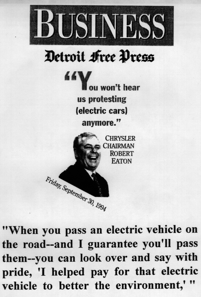 Professor Utterback feels that there is ongoing development within this particular "tree," if you will, going from natural ice harvesting to machine ice making to refrigeration and now to aseptic packaging. However, we do not have to go back 100 or 150 years to look at the examples of dismissal of technology change on the part of an established concern with a proven technological base. There are good inertial reasons for this dismissal, considering the investment in the way things were or are. I put before you a quote from the September 30, 1994, Detroit Free Press made by the Chairman of Chrysler Motor Company and his reaction to the electric vehicle and the electric vehicle technology to show you that this phenomenon continues.